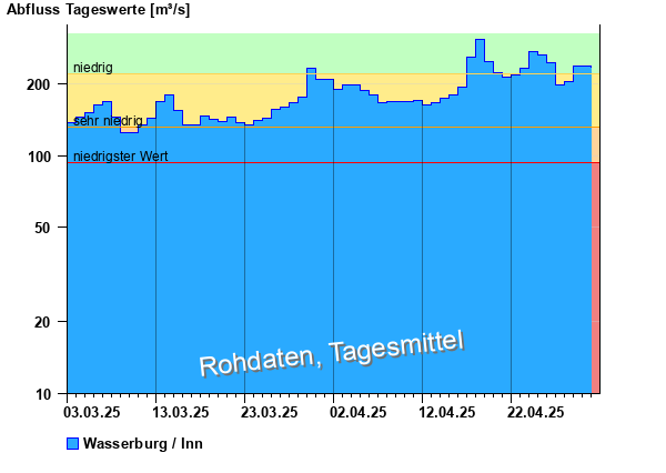 Wasserführung bleibt auf hohem niveau. Der pegelverlauf zeigt deutlich den schwellbetrieb der kraftwerkskette am inn auf schweizer bundesgebiet. Die bundesstadt bonn kann keine haftung und gewähr für die richtigkeit. Der inn hat im landkreis mühldorf bereits meldestufen überschritten. An der mündung in passau fließen im mittel 738 m³/s wasser in die nur 690 m³/s heranführende donau.